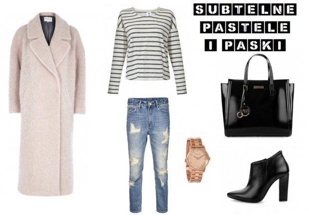 Nasza druga propozycja jest przygotowana dla osób lubiących bawić się modą. Połączyliśmy w niej kilka trendów m.in. pastele i paski. W obecnym sezonie bardzo modne stały się długie płaszcze, sięgające niemalże do kostek. Jeżeli na dodatek, są jeszcze w odcieniu pudrowego różu, szarości, bądź subtelnego baby blue, to mogą zostać okrzyknięte największym  hitem jesieni 2014! Naszym zdaniem do takiego płaszcza wspaniale pasuje „pasiasta”, luźna bluzka oraz spodnie z dziurami typu boyfriend. Dodatki to czarne skórzane botki, duża, idealnie pasująca torebka oraz złoty zegarek.