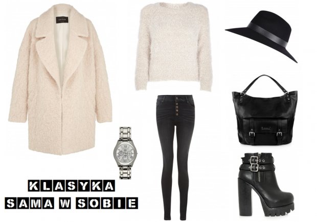 Nasza pierwsza propozycja to klasyka sama w sobie, ponieważ łączy dwa, pasujące niemalże na każdą okazję kolory – ecru oraz czerń. Płaszcz w stylu oversize, który możecie znaleźć w najnowszej kolekcji River Island idealnie komponuje się z puchatym sweterkiem. Czarne rurki z podwyższonym stanem wysmulką talię i ukryją drobne mankemtnty figury. Wysokie, na pozór masywne botki, które naszym zdaniem są hitem tego sezonu, optycznie wydłużą i również wysmuklą, nogi. Z uwagi na to, że proponowane przez nas zestawy są codzienne, nie mogło obyć się bez dużej torebki. My stawiamy na skórzaną propozycję z nowej kolekcji marki Primamoda. Elementem uzupełniającym jest srebrny zegarek oraz czarny kapelusz.