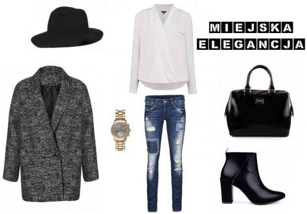 Jeżeli lubisz być ubrana egegancko, ale zarazem cenisz sobię wygodę, to nasza ostatnia stylizacja na pewno przypadnie Ci do gustu! Elementem głównym jest w niej szary, bardzo ciepły płaszczyk. Naszym zdaniem świetnie pasuje do niego biała, luźna koszula, jeansy z przetarciami, złoty zegarek oraz czarne dodatki w postaci kapelusza, jednego z najmodniejszych modeli botków w tym sezonie oraz torebki z lakierowanej skóry.