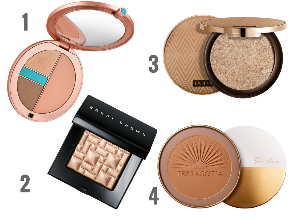 Kiedy twarz jest gładka pora podjąć decyzję czy ma być opalona, czy blada. Jeśli chcesz mieć ozłoconą cerę zamiast jasnego pudru, wybierz kosmetyk brązujący. Wielofunkcyjny puder, który równomierną „opalenizną” pokrywa twarz i ciało. Jego forma, sypki, w kamieniu czy w pędzlu, nie ma znaczenia, ale jeśli skóra ma wyglądać naturalnie, wybierz matowy. Chociaż zarówno wieczorem, jak i w mocnym słońcu pięknie prezentują się też te lekko połyskujące. Muskam nim wystające części czyli czoło, policzki i brodę oraz ramiona czy dekolt. Trzeba go nakładać z umiarem, najlepiej z góry na dół, tak jak padają na nas promienie słoneczne. Na koniec warto delikatnie przypudrować skórę na szyi, aby zmniejszyć kolorystyczny kontrast. Natomiast lepiej nie podkreślać ciemnym pudrem konturu twarzy, poniżej żuchwy, w stylu lat 80. Skóra będzie wyglądać jakby była brudna, a tego przecież nie chcesz. Odrobiną wielofunkcyjnego kosmetyku czy pudru rozświetlającego pomaluj kości policzkowe i powieki. Taki monochromatyczny makeup jest nie tylko piękny, ale też praktyczny, szczególnie na wakacjach. Jeden produkt i pełen makijaż.