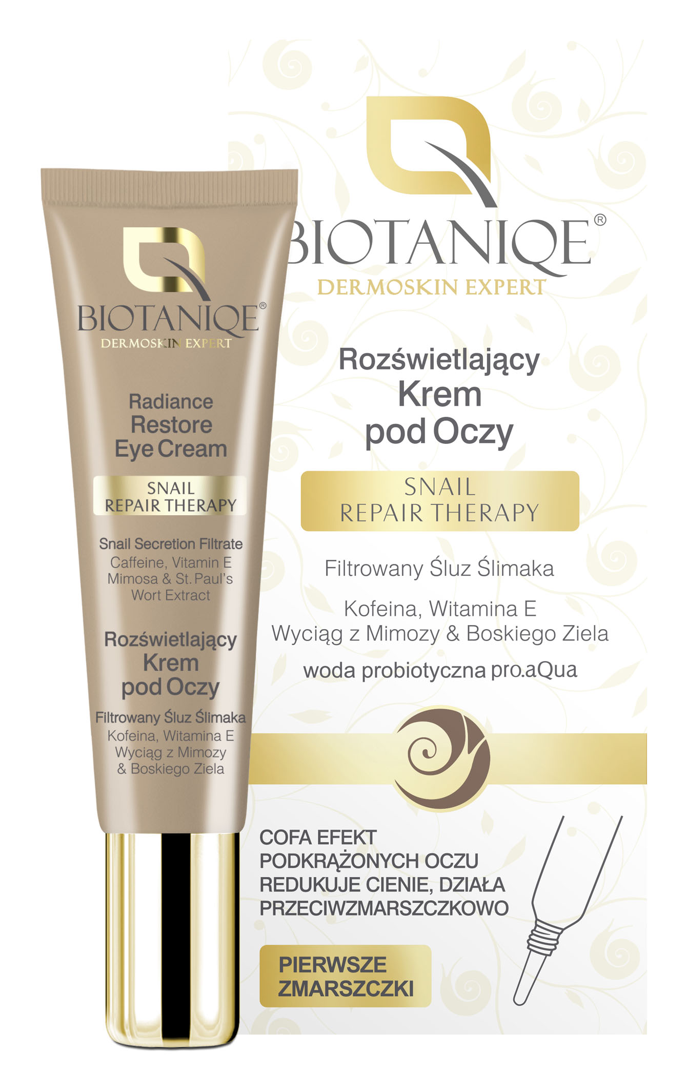 Rozświetlający krem pod oczy hamuje oznaki starzenia i zmęczenia pojawiające się wokół oczu. Spłyca zmarszczki oraz zapobiega pojawianiu się nowych. Utrzymuje intensywne nawilżenie skóry, dzięki czemu staje się ona gładka i sprężysta. Zawarty w kremie wyciąg z mimozy i boskiego ziela cofa efekt podkrążonych oczu, redukuje opuchliznę oraz cienie pod oczami. Kofeina dodaje skórze energii. Witamina E działa silnie antyoksydacyjnie.