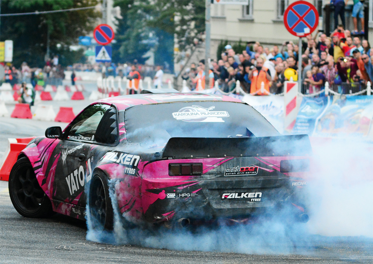 Tak, to jest dość śmieszna historia. Ja cały czas chodzę w butach na wysokim obcasie, uwielbiam szpilki i jeżdżę w szpikach. Nawet często polemizuje z innymi, bo uważam, że wbrew pozorom, świetnie się w nich prowadzi – noga ma bardzo dobry punkt podparcia na szpilce. Oczywiście na zawodach jeżdżę w profesjonalnym płaskim obuwiu. Z tymi wspomnianymi szpilkami było tak, że przyjechałam na pierwsze zawody driftingowe, które odbywały się w Poznaniu, w 2005 roku, a wówczas 90 procent z nas nie wiedziało czym jest drifting. Ja tam pojechałam tylko obejrzeć zawody. Maciej Polody, który wprowadził drifting do Polski, przyszedł do mnie i mówi, „Karolina, Ty kupiłaś sobie już auto do driftu, jedziesz driftować!” . Odpowiedziałam, „Maciej, ale ja mam jeden komplet opon, buty na szpilkach, no jak mam to zrobić?” Ale on się upierał: „Jedziesz w zawodach!” i tak się stało. Łatwo mnie podpuścić i lubię wyzwania. Wystartowałam w tych butach na obcasach, z jednym kompletem opon, a musiałam tym samym samochodem, po zawodach, wrócić do domu. A żeby dać czytelnikom wyobrażenie ogromu problemu, powiem tylko, że opony są zużywane w błyskawicznym tempie. Jeden komplet starcza na zaledwie kilku minut, a w czasie weekendu zużywamy ich około czterdziestu, a po zawodach opony nie nadają się do dalszej jazdy.