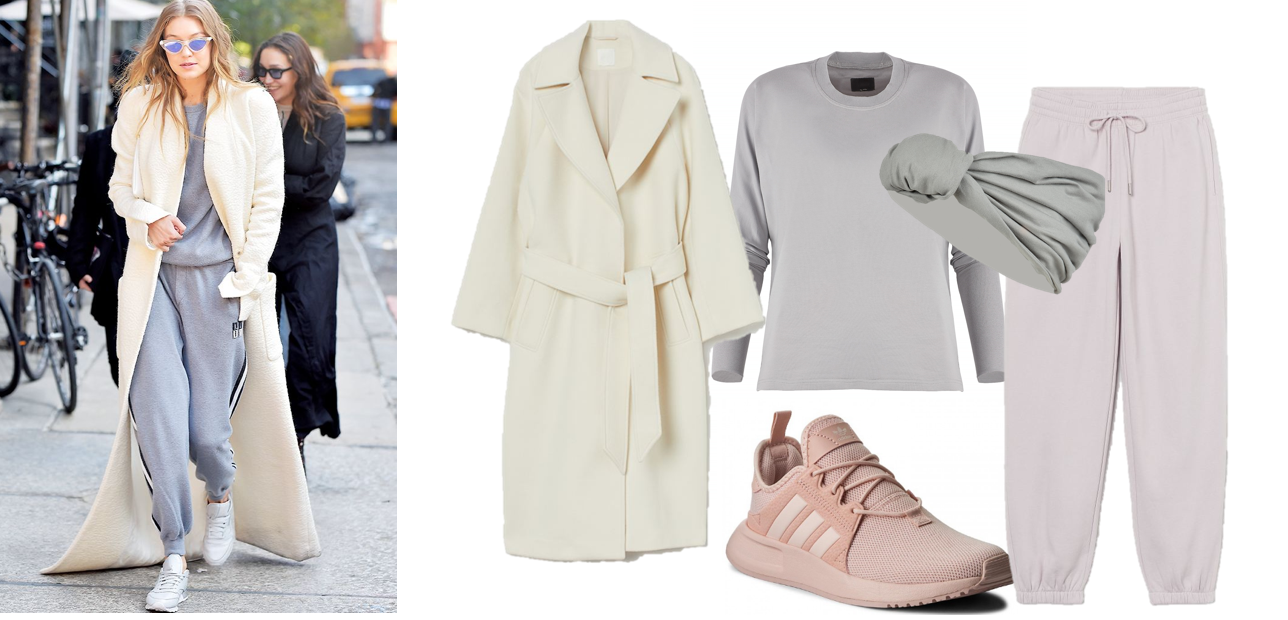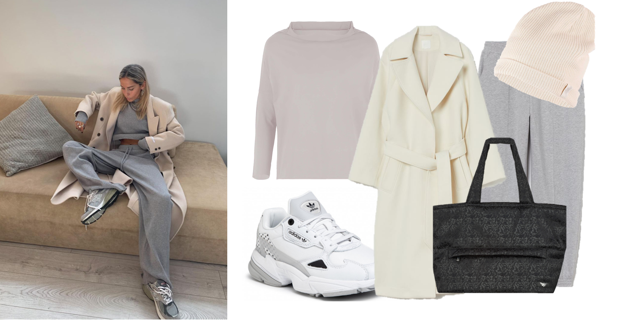Płaszcz H&M 279,99 zł, bluza by Insomnia 159 zł, spodnie H&M 59,99 zł, buty Adidas 279 zł, opaska by Insomnia 69 zł