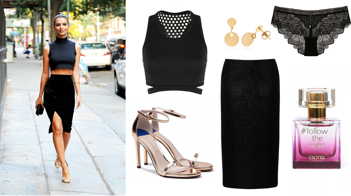 Top Gym Hero 119 zł, spódnica Never Ever 315 zł kolczyki Luna Mood 130 zł buty Stuart Weitzman 1479 zł, perfumy Esotiq 79,90 zł, majtki Esotiq 54,90 zł