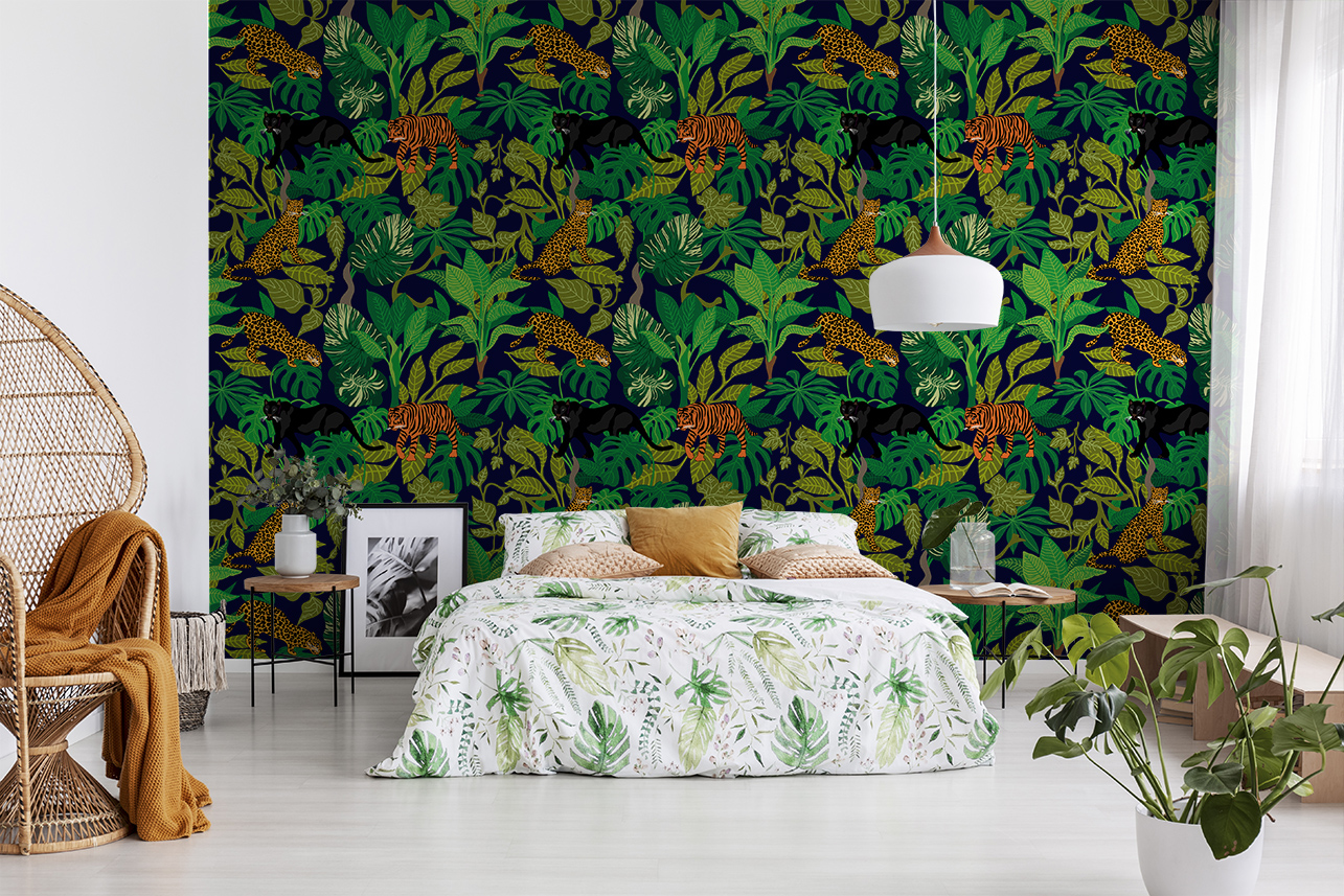 Na zupełnie przeciwległym biegunie znajduje się drugi trend, któremu chcemy się przyjrzeć. Bazuje on na naprawdę intensywnych odcieniach, dlatego sprawdzi się w przestronnym metrażu. To z pewnością propozycja dla osób lubiących eleganckie, pełne szyku aranżacje, w których możemy się poczuć wytwornie i stylowo. Jakie kolory pojawią się na ścianach? Postawmy na szlachetną paletę: malachitowy, szmaragdowy, kobaltowy lub szafirowy. Drogocenne minerały mogą się stać dla nas także dosłowną inspiracją. Fototapeta do sypialni, imitująca jeden z wymienionych przed chwilą kamieni, pozwoli nam wyczarować wystrój o niepowtarzalnym charakterze. Drugi wariant dekoracyjny skierowany jest do miłośników tropików. Jest to bowiem wzór ukazujący gęsta plątaninę liści i zarośli, pomiędzy którymi rosną kolorowe, egzotyczne kwiaty jak storczyki i strelicje królewskie lub kryją się dzikie zwierzęta – tygrysy i pantery. Ciekawy trend, który w tym roku cieszy się naprawdę dużą popularnością, dotyczy sposobu aranżowania fototapety. Nie musi ona pokryć całej ściany. Wystarczy, że przykleimy jeden pas wzoru na przykład za wezgłowiem łóżka. Takie oszczędne wykorzystanie ściennej dekoracji jest rozsądnym rozwiązaniem w sytuacji, gdy sam zagłówek jest bardzo ozdobny (welurowy i pikowany), a w sypialni znajdują się inne przykuwające oko dodatki – mosiężne i połyskujące kinkiety lub żyrandol o szklanych paciorkach.
