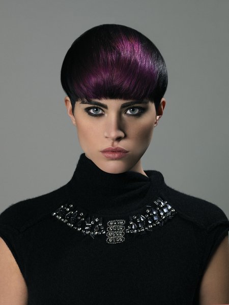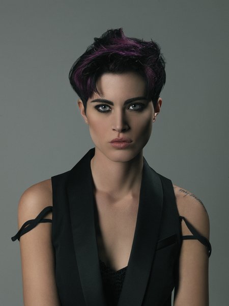 Klasyczna fryzura, ale jednocześnie zaskakująca i tajemnicza. Ważnym jej elementem jest kolor, który powstał dzięki technice łączącej ciemny brąz oraz niesamowity odcień fioletu w grzywce. Fiolet kontrastuje z resztą włosów, tworząc różne refleksy w zależności od sposobu ułożenia fryzury. Niesamowitą formę uzyskano nie tylko za pomocą odpowiedniego cięcia, ale również poprzez odpowiednie ułożenie włosów. Jak je wykonać? Najpierw nakładamy na na włosy AND Magic Serum 26, aby ułatwić ich rozczesywanie. Następnie spryskujemy preparatem AND Liss Spray 15, by nadać włosom połysk, a jednocześnie zapobiec ich puszeniu się. Potem suszymy włosy przy użyciu płaskiej szczotki modelując i naciągając je w dół. Następnie modelujemy włosy na całej głowie za pomocą okrągłej szczotki, przywiązując szczególną wagę do kontrastowej grzywki. Na koniec fryzurę utrwalamy lakierem AND Vamp Spray 44. Ta niesamowita fryzura pozwala także na wiele innych stylizacji. Wystarczy kilka ruchów, by ją całkowicie zmienić i uzyskać nowy wizerunek – pełen luzu i swobody.