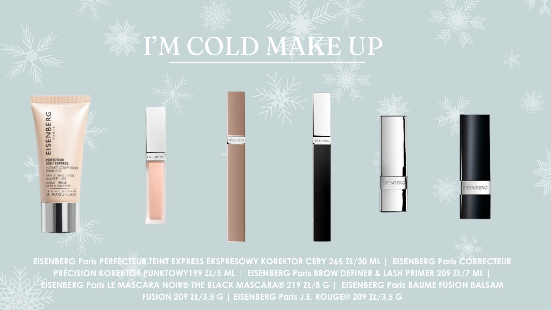 Nawet jeśli zimowa aura przypomina raczej późną, mocno błotnistą jesień – możesz poczuć się jak na ośnieżonym, górskim stoku. Hasło #imcoldmakeup ma już ponad 25 milionów odsłon! Ten trend jest inspirowany mroźnymi zimowymi dniami, gdy skóra nabiera naturalnych rumieńców, a usta i czubek nosa czerwienieją od niskiej temperatury. Ważnym elementem jest porcelanowa, jasna, doskonale wyrównana skóra, na której te wszystkie zaróżowienia wyglądają bajkowo, a nie jakbyś była chora i zmęczona. Uwaga: nie chodzi tu o warstwę podkładu – raczej o dyskretne użycie kremu koloryzującego i korektora tak, aby ukryć wszystko, co nie pasuje nam do tego looku. Skóra powinna być naturalna. Warto użyć tu też kropli do oczu (czerwone oczy nie będą nam tu pasować) oraz starannie wyczesać brwi – włoski powinny wyglądać niemal jakby były lekko zamarznięte lub nawet pokryte szronem. Policzki, usta i czubek nosa powinnyśmy delikatnie zaróżowić, a rzęsy wytuszować tak, aby wyglądały naturalnie, ale były widoczne. Wisienką na lodowym torcie jest srebrzysty rozświetlacz, którym zaznaczamy wewnętrzne kąciki oczu i łuk Kupidyna (czyli zagłębienie nad górną wargą). I to tyle, aby stać się „THAT GIRL” tej zimy. Francuska marka EISENBERG Paris proponuje zestaw produktów, którymi nie tylko wykonasz perfekcyjnie, mroźny makijaż, ale także zadbasz o cerę, bo każdy z tych kosmetyków ma również działanie pielęgnacyjne.