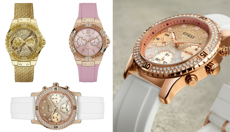 W tym sezonie obok ubrań, J.Lo promuje nową linię zegarków Guess. Sesję zdjęciową w stylowej willi wykonała Tatiana Gerusova. Inspiracje czerpała z życia gwiazdy – z jednej strony performerka w Las Vegas, z drugiej aktorka w Hollywood. Na planie Jennifer Lopez prezentuje trzy zniewalające czasomierze – W0198L5, W1053L3, W0775L13. Model W0198L5 to iście wiosenna propozycja w kolorach bieli i różowego złota. Wyszukaną kopertę bogato zdobią kryształy, ale na szczególną uwagę zasługuje tarcza. Zaprojektowana w stylu konfetti wprowadza nutę szaleństwa i modowej wariacji, czym od razu rzuca się w oczy. Guess W1053L3 to słodka propozycja dla fanek dziewczęcych, romantycznych kolorów. Różowy pasek oraz cyferblat zestawiono z kopertą w różowym odcieniu złota. Kolekcję zamyka odważny model W0775L13. Zegarek skąpano w złotej barwie, a image podkręcono drapieżną nutą. Designerzy Guess uwielbiają czerpać inspiracje ze świata zwierząt, dlatego w projektach często wykorzystują print pantery czy imitacje skóry węża lub krokodyla. Ten model uosabia wszystkie te fascynacje. W przeciwieństwie do pozostałych zegarków, w których paski wykonano z tworzywa sztucznego, tutaj wykorzystano naturalną skórę. Całość delikatnie dekorują kryształy oraz odważne wzory imitujące skórę węża.