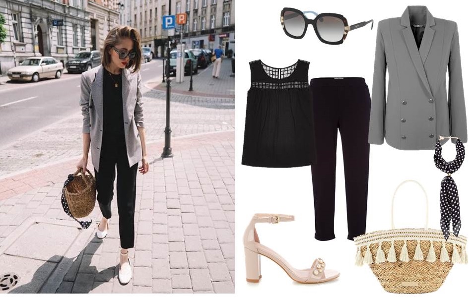 Okulary Prada/Optical Christex 1090 zł, top Moodo 34,99 zł, spodnie Cross Jeans 89,90 zł, marynarka Nife 159 zł, apaszka Bonprix 37,99 zł, buty Primamoda 369 zł, koszyk Primamoda 199 zł.
