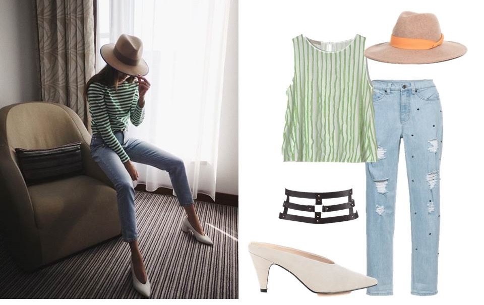 Bluzka Stefanel 379 zł, kapelusz Parfois 89,90 zł, dżinsy Bonprix 124,99 zł, pasek Bijoux Indiscrets 259,99 zł, buty Primamoda 379 zł.