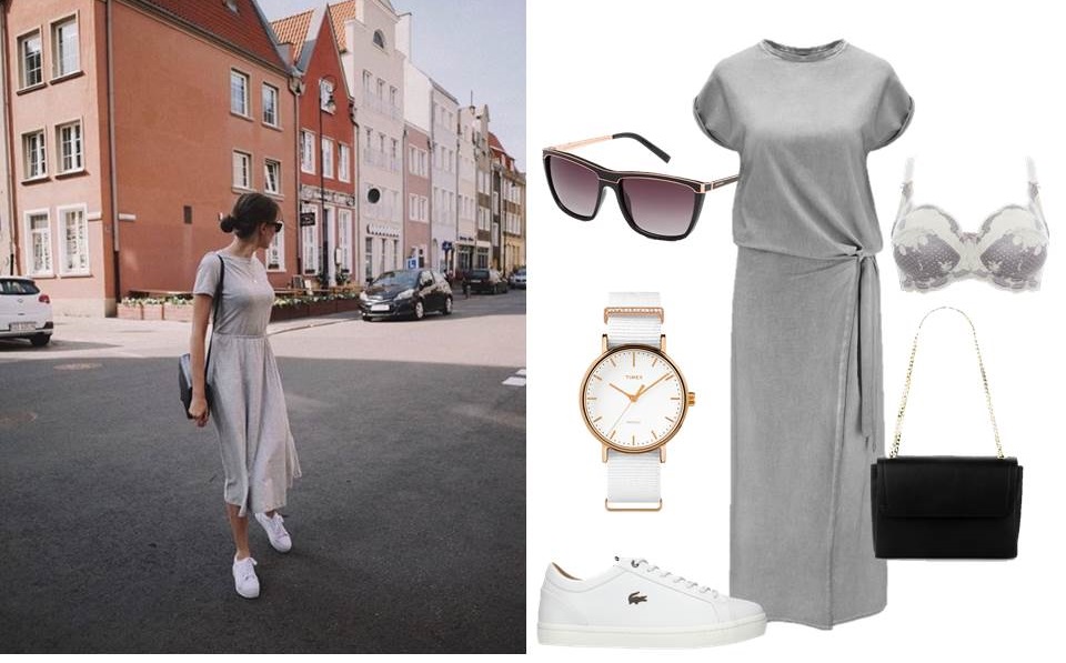 Okulary Solano 260 zł, sukienka Diverse 139,99 zł, zegarek Timex/Answear.com 1369,90 zł buty Lacoste/Symbiosis 569,99 zł, biustonosz Panache 199 zł, torebka Primoamoda 399 zł.