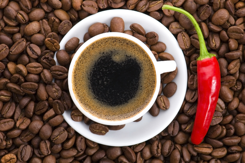 Kofeina z kawy rozgrzewa, bo stymuluje organizm do wytwarzania ciepła. Jednocześnie zwiększa liczbę spalanych kalorii, co może pomóc nam schudnąć! Żeby wzmocnić to działanie, do kawy dobrze dodać odrobinę… chili. Zawarta w ostrej papryczce kapsaicyna przyspiesza metabolizm i spalanie tłuszczu. Właśnie dlatego po zjedzeniu czegoś ostrego robi nam się często gorąco :).