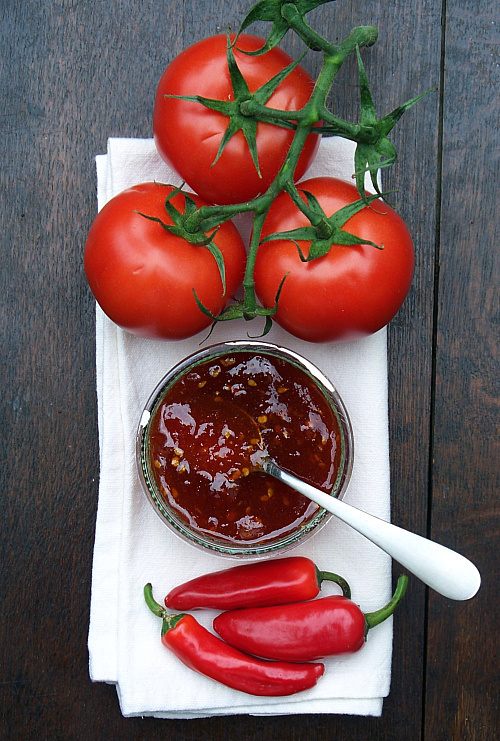 Składniki: 500 g dojrzałych pomidorów, 2-4 papryczki chili (w zależności od tego, jak pikantny ma być dżem, zwolennicy ostro przyprawionych dań dadzą 4 papryczki razem z nasionami), 4 obrane ząbki czosnku, 2,5 cm świeżego korzenia imbiru, 30 ml sosu rybnego (nam pla), 310 g cukru, 100 ml czerwonego octu winnego (może to być też ocet z sherry).