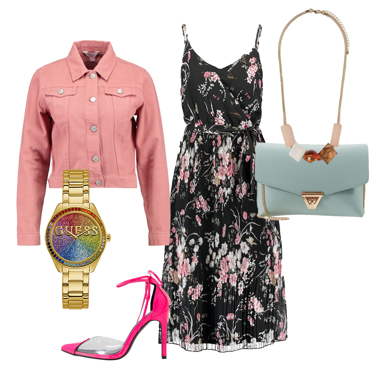 Sukienka Only 209 zł, szpilki Public Desire 149 zł, naszyjnik HM 49,90 zł, zegarek Guess 739 zł, torebka Dorothy Perkins 129 zł, kurtka Miss Selfridge 189 zł