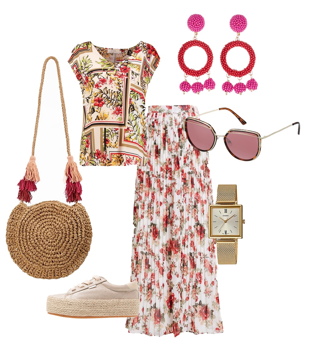 Spódnica Vila 229 zł, bluzka Cream 189 zł, zegarek Casio Vintage 499 zł, okulary Mint and Berry 84 zł, buty mtng 169 zł, torebka Parfois 109 zł, kolczyki Pieces 64 zł
