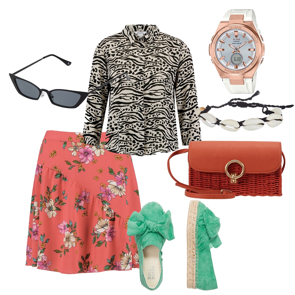 Spódnica JDY 64 zł, koszula Monki 84 zł, zegarek Baby-G 799 zł, buty Bull Boxer 219 zł, okulary Even and Odd 64 zł, bransoletka Only 64 zł, torebka New Look 109 zł
