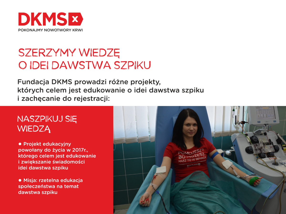 Decyzja o zarejestrowaniu się, jako potencjalny dawca szpiku, powinna zostać podjęta świadomie, dlatego cieszy nas, że osoby zainteresowane dołączeniem do bazy Fundacji DKMS zadają pytania – i szukają na nie rzetelnych odpowiedzi. Dlatego właśnie ustanowiony został Miesiąc Świadomości Idei Dawstwa Szpiku i powstał projekt „Naszpikuj Się Wiedzą”, za pomocą których przekazujemy wiedzę  mówi Magdalena Przysłupska, rzecznik prasowy Fundacji DKMS.