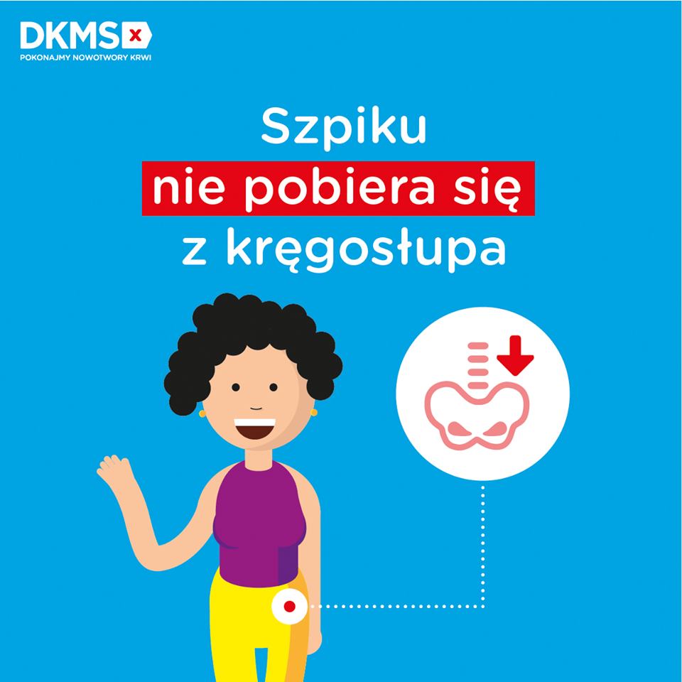 To największy mit związany z dawstwem szpiku, który niestety wciąż – choć już w mniejszym stopniu  funkcjonuje w świadomości części społeczeństwa. A odpowiedź na to pytanie jest prosta  szpiku oczywiście nie pobiera się z kręgosłupa! Transplantolodzy stosują w tym celu jedną z dwóch metod: pobranie szpiku z talerza kości biodrowej lub krwiotwórczych komórek macierzystych z krwi obwodowej – żadna z metod nie ma nic wspólnego z kręgosłupem. O tym, która z nich zostanie zastosowana w przypadku konkretnego dawcy, zawsze decyduje lekarz prowadzący pacjenta, uwzględniając jego stan zdrowia oraz chorobę.