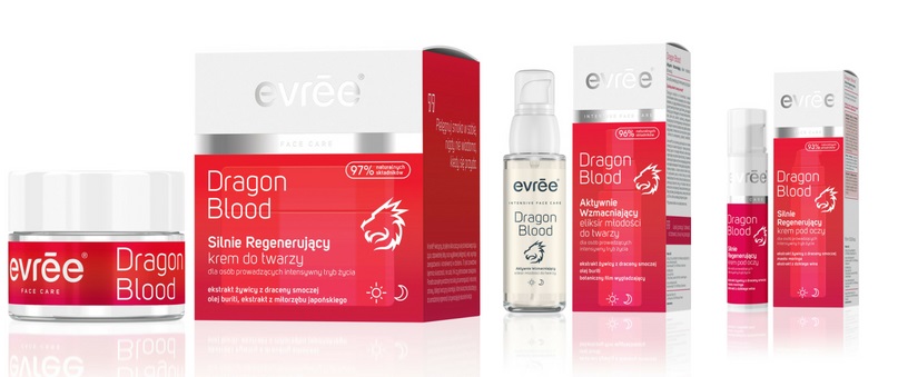 Nowa linia evrēe® Dragon Blood – po raz pierwszy na polskim rynku wykorzystuje moc żywicy z draceny smoczej, która niezwykle wzmacnia i regeneruje skórę. Życiodajna esencja, dzięki zawartości katechin i antocyjanów ma silne właściwości przeciwutleniające, przeciwzapalne i przede wszystkim – antyoksydacyjne. Przeciwdziała powstawaniu zmarszczek, a w połączeniu z innymi składnikami aktywnymi, linia Dragon Blood to prawdziwy eliksir młodości.