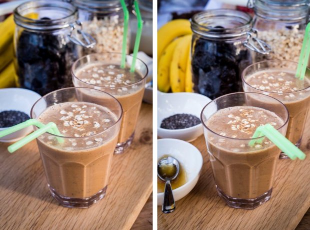 Zaletą tego przepisu jest to, że wszystkie najlepsze śniadaniowe składniki łączą się w jeden, szybki w przygotowaniu i pyszny koktajl. Płatki owsiane zawierają węglowodany złożone, które są trawione powoli przez cały poranek, banany dostarczają duże ilości potasu, który wspomaga pracę mięśni, mleko i jogurt są źródłem wapnia, który wraz z witaminą K i manganem znajdującym się w śliwkach suszonych pomaga zachować zdrowie kości. Nasiona chia są źródłem dobrych, nienasyconych tłuszczy, a pyszne suszone śliwki są bogate w potas, który m.in. wspiera pracę systemu nerwowego i pomaga utrzymywać odpowiednie ciśnienie krwi. Śliwki suszone są także źródłem miedzi, która wspiera prawidłową pracę układu odpornościowego oraz transportu żelaza w ciele. A ponieważ suszone śliwki wspierają pracę układu trawiennego*, ten koktajl świetnie oczyszcza organizm. Ale co najważniejsze smakuje wyśmienicie!