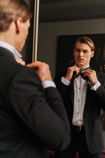 W wyborze dodatków, takich, jak krawat lub mucha wszystkie chwyty są dozwolone. Wszystko zależy od naszego gustu i fantazji. Nic nie przebije elegancją klasycznej wiązanej muchy. Wielu panów młodych tak bardzo chce być najlepszą wersją siebie, że zaczyna kombinować. Najgorzej jeśli do salonu przychodzi ktoś, kto nie wie co woli, bo tak naprawdę krawat czy muchę miał na sobie ostatni raz kiedy szedł do komunii. Chcąc sprostać decyduje się na element, który absolutnie mu się nie podoba, ale wszyscy mówią, że w różowej muszce wygląda świetnie. Zatem zadajmy sobie pytanie w czym będziemy się czuć bardziej komfortowo. Krawat zawsze pozostaje bezpieczniejszym rozwiązaniem.