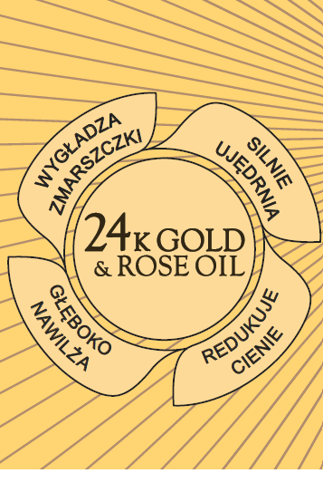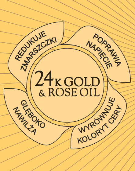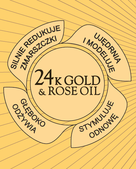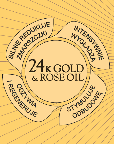 Zaawansowany biotechnologicznie kompleks peptydu i molekuł 24-karatowego złota połączony z wyjątkową siłą oleju i ekstraktu z róży. Ta unikalna fuzja składników aktywnych zapewnia spektakularne efekty odmładzające, redukując ilość, długość, szerokość i głębokość nawet utrwalonych zmarszczek. Dodatkowo stymuluje procesy odnowy w naskórku, opóźniając starzenie się skóry.