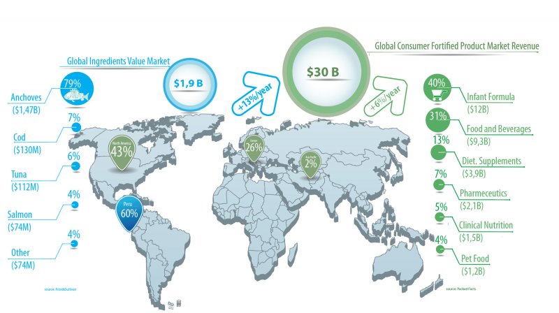 60-70% światowej produkcji oleju rybiego pochodzi z Peru i Chile, gdzie na gigantyczną skalę trzebi się zdziesiątkowaną już populację nie dorsza, a sardeli.