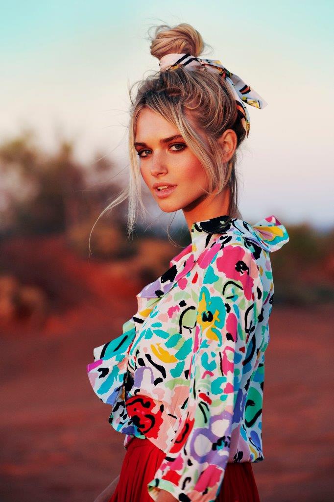 — Zadbaj zarówno o objętość, jak i teksturę włosów. Na początek, na rozczesane włosy, pasmo po paśmie nałóż Dry Finish Texture Spray Eleven Australia. Jeśli twoje włosy nie są świeżo umyte, ten produkt dodatkowo odbije je u nasady i wchłonie nadmiar sebum. Przeczesz włosy palcami a następnie zbierz je w wysoki kucyk na czubku głowy. Musi być luźny, nie wygładzaj go, wypuść kilka kosmyków dookoła twarzy. Następnie zakręć kucyk dookoła gumki i przypnij oryginalną spinką lub by nadać fryzurze stylu i nonszalancji, przewiąż je ozdobną apaszką — radzi Joanna Kowalczyk.