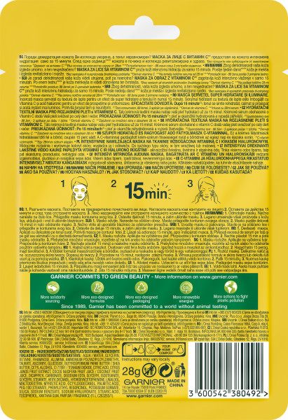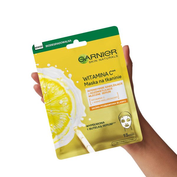 Kwas hialuronowy i witamina C w masce na tkaninie od Garnier Skin Naturals. Efekty po 15 minutach: maska nasączona formułą odpowiadającą jednej butelce serum* sprawia, że cera jest wyraźnie wygładzona, a jej koloryt wyrównany. Skóra nabiera blasku i świeżości. Maska dobrze dopasowuje się do kształtu twarzy, dzięki czemu jest komfortowa w stosowaniu, nie spada i pozwala na swobodne poruszanie się. Odpowiednia dla każdego typu skóry, w tym wrażliwej lub matowej. Biodegradowalna tkanina**. *Serum o pojemności 28 ml. **Biodegradowalna w warunkach domowego kompostowania. Odpowiednia także jako odpad BIO.