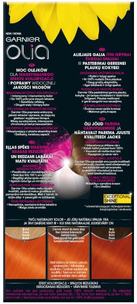 Moc olejków dla maksymalnego efektu koloryzacji i poprawy widocznej jakości włosów Unikalna formuła kremu koloryzującego Olia, zawierająca 60% naturalnych olejków kwiatowych, ułatwia wnikanie koloru w głąb włosa, co skutkuje maksymalnym efektem nasycenia i trwałym rezultatem. Kolor jest intensywny, a włosy wyglądają zdrowiej, są bardziej miękkie i pełne blasku. Olia nie zawiera amoniaku, więc ma przyjemny, zmysłowy zapach.