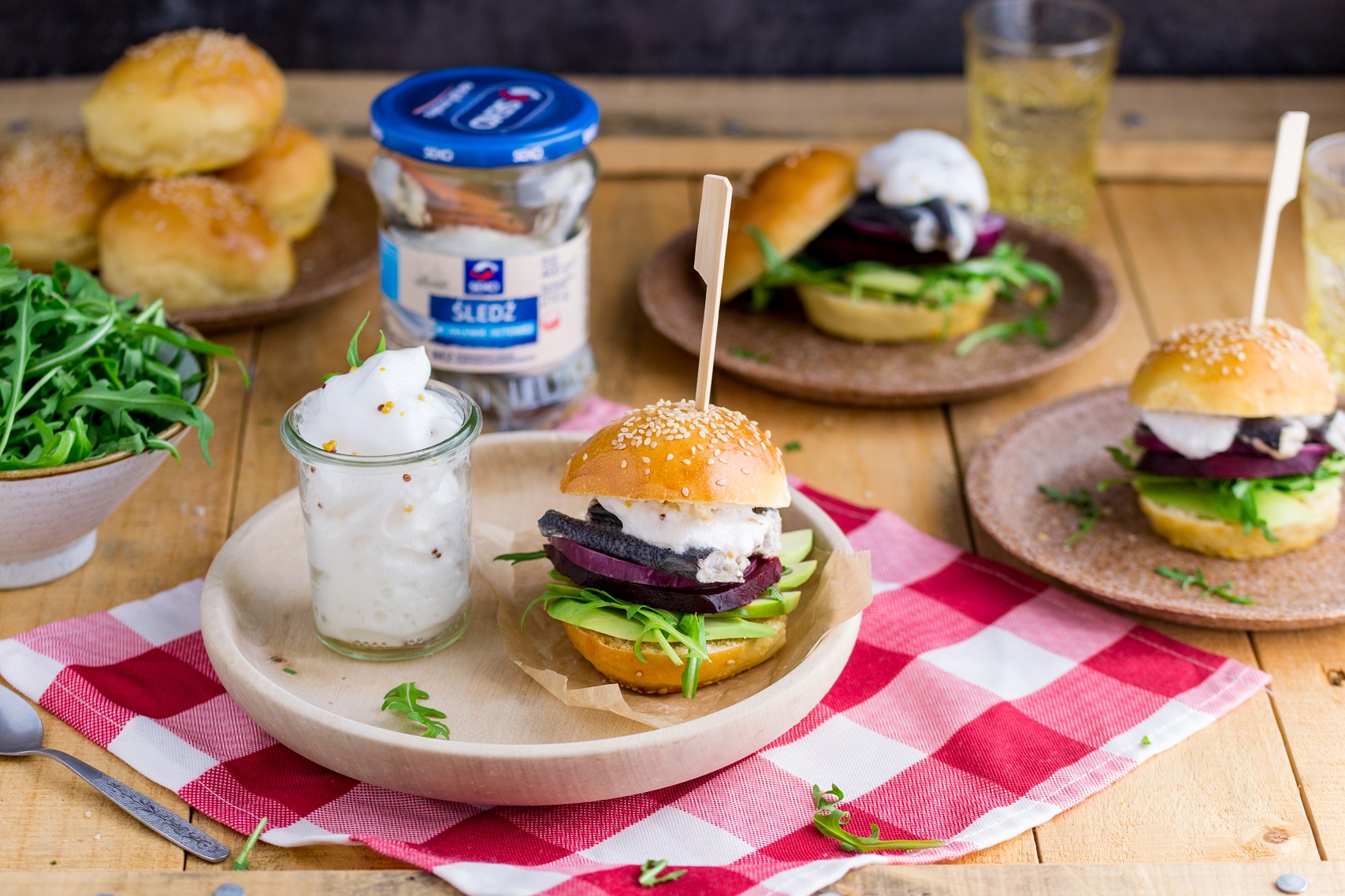 Miniburgery ze śledziem, awokado, burakiem i pianką z musztardy francuskiej