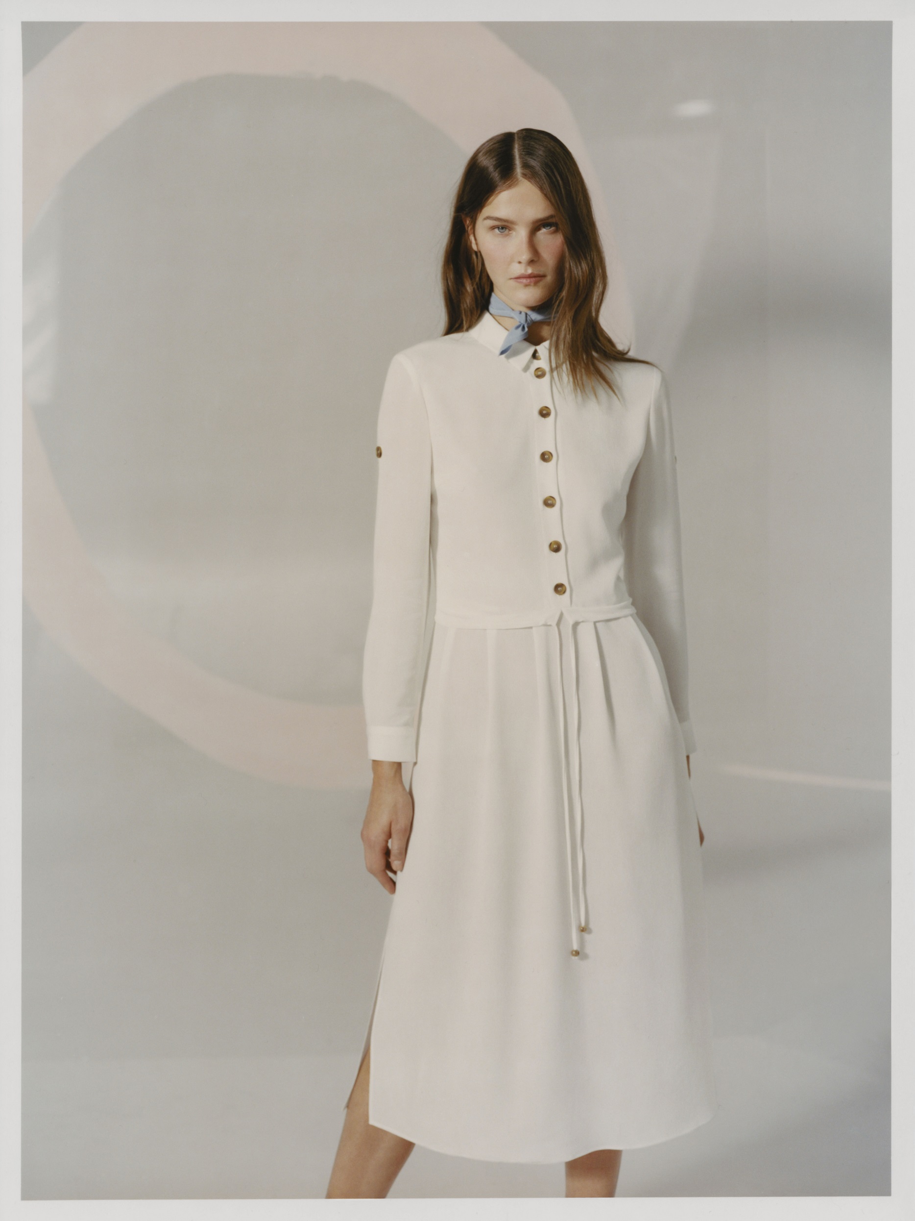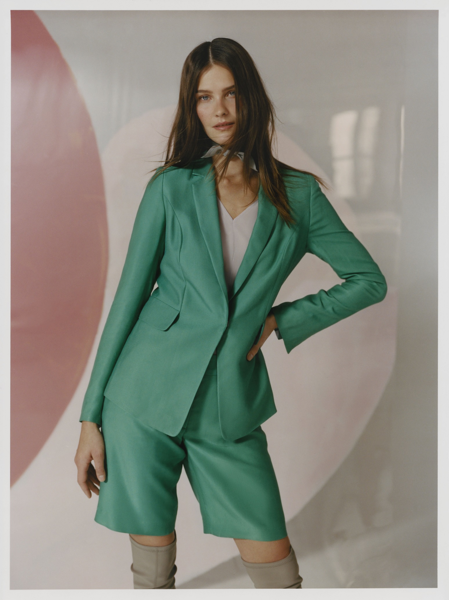 Linia, która czerpie inspiracje ze stylu marine, ale w zdecydowanie mniej oczywistej formie. Tym razem ten styl pojawi się już na początku sezonu, a nie w pełni lata. Uzupełnieniem granatu nie jest oczywista czerwień, ale kolory wynikające z masy perłowej – zgaszony błękit, turkus i lila. Paski pojawiają się w kolekcji, ale nie w wydaniu casualowego sweterka; tylko wypracowanego garnituru o mocnej, nieco męskiej formie. Guziki również nawiązują do stylu marine – są wykonane z masy perłowej lub perły, dla kontrastu w niektórych modelach pojawiają się nowoczesne metalowe napy. Ta linia to esencja power dressing.