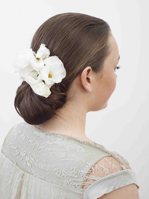 Gładki kok to klasyczna fryzura odpowiednia zarówno dla panny młodej, jak i druhny. Zaczesane włosy pozwolą na wyeksponowanie twarzy oraz linii szyi i ramion. Kwiaty dodadzą kompozycji lekkości i sprawią, że fryzura nabierze wyjątkowego charakteru.