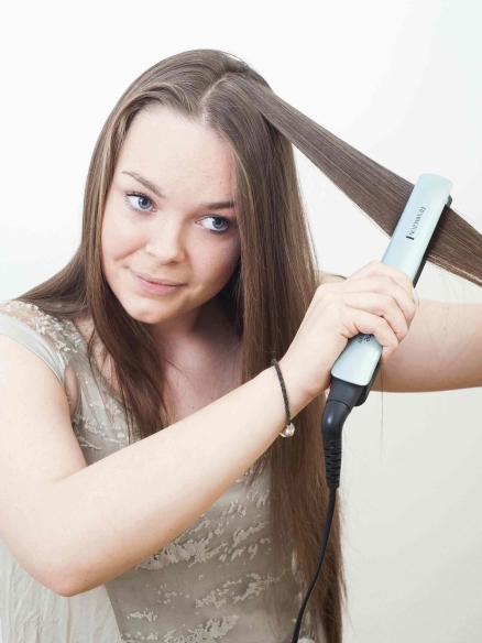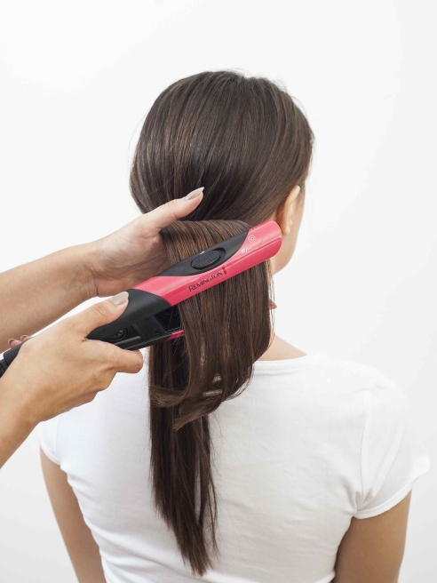 Krok pierwszy: Wyprostuj włosy prostownicą Stylist Multi Style marki Remington, a następnie zwiąż je w kucyk tuż przy karku.