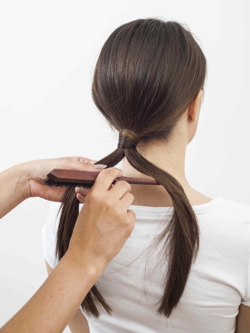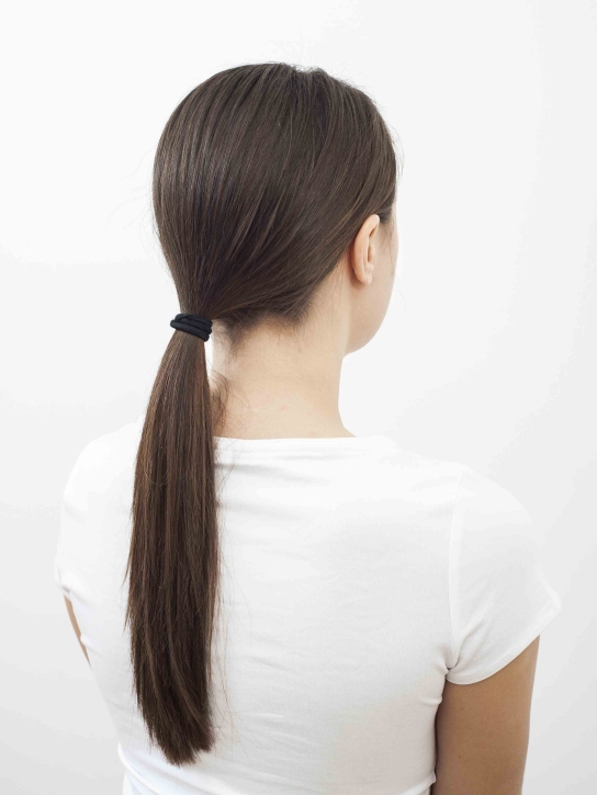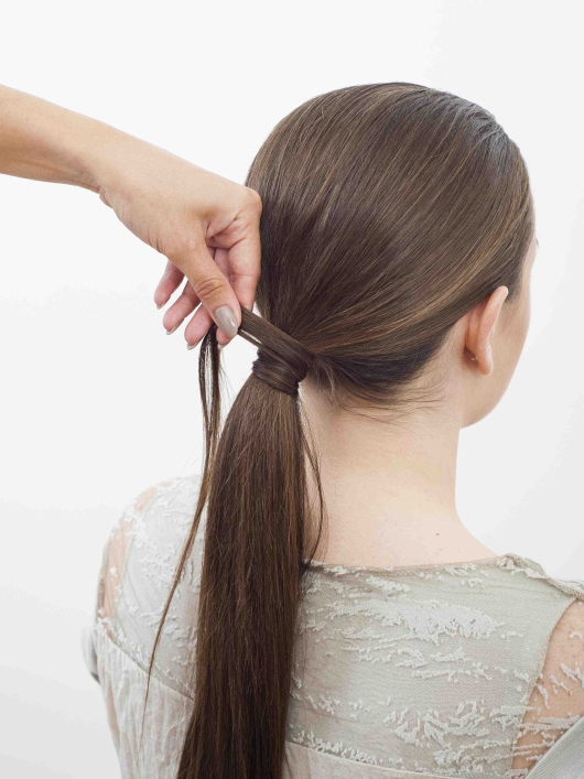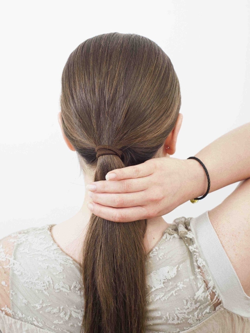 Rada: Użyj gumki w odcieniu zbliżonym do koloru twoich włosów. Możesz wykorzystać gumkę z haczykami, dzięki czemu łatwiej zwiążesz włosy pozostawiając je idealnie wygładzonymi.