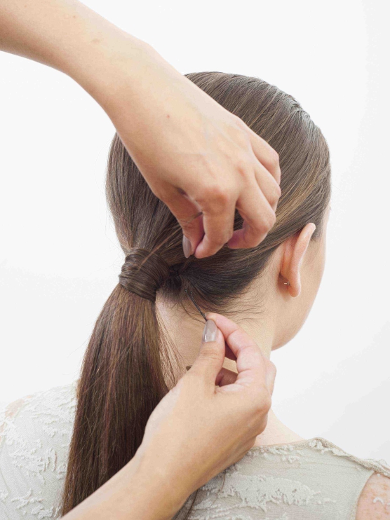 Krok trzeci: Oddziel kosmyk włosów z kucyka i obwiąż go równomiernie wokół gumki, tak aby nie było jej widać spod włosów.