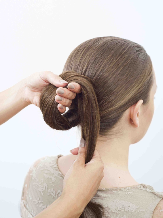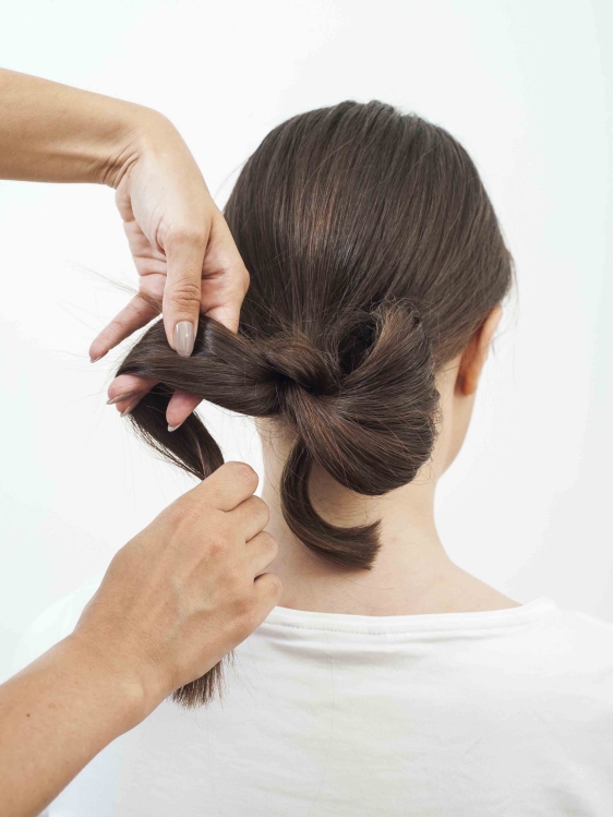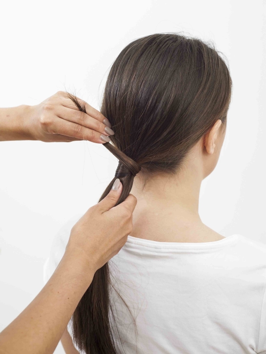 Krok piąty: Chwyć kucyk w obie ręce i delikatnie zawiń go do góry tworząc pętlę. Jej wielkość dostosuj do długości włosów.