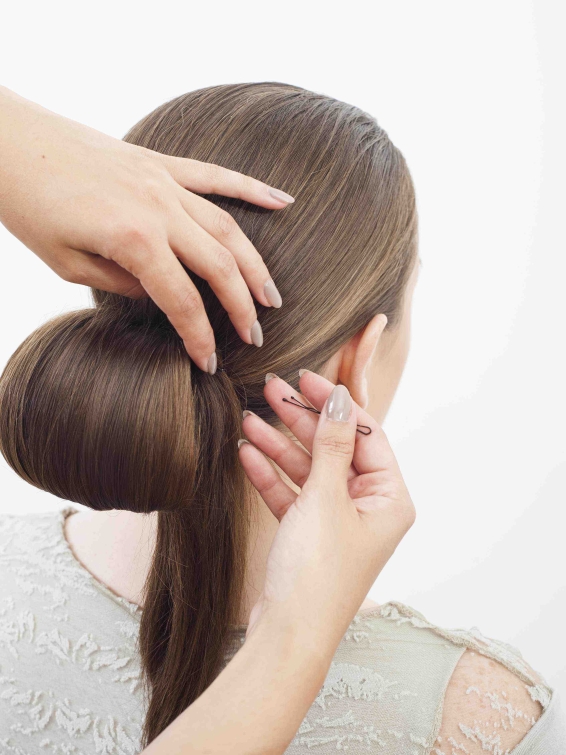 Krok czwarty: Przypnij końcówkę kosmyka wsuwką od spodniej części kucyka, tak aby spinka była jak najmniej widoczna.