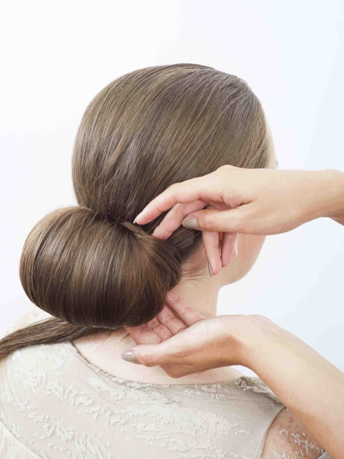 Krok siódmy: Luźną część kucyka, która pozostała po przypięciu koka, wprowadź do jego środka. Jeśli masz bardzo długie włosy, możesz tę część włosów dodatkowo przypiąć spinkami. Następnie używając dwóch rąk delikatnie rozłóż włosy po bokach koka tak, aby tworzyły kulę. Podtrzymuj całą konstrukcję od spodu jedną ręką, a drugą przesuwaj ostrożnie kolejne warstwy włosów. Kok powinien tworzyć regularną kulę. Na koniec przypnij kilka kosmyków do boku głowy zabezpieczając uzyskany kształt.