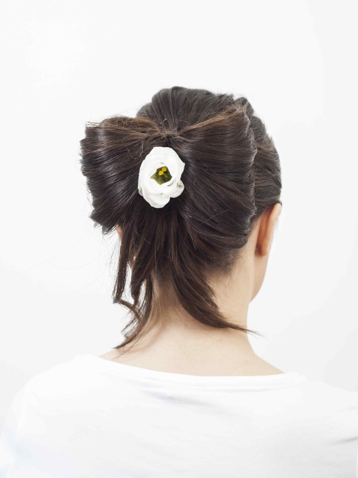 Włosy upięte w formę kokardy  – ta niestandardowa fryzura jest wyjątkowo dziewczęca, a do tego bardzo prosta w wykonaniu. Pojedyncze kwiaty wplecione w kok sprawią, że nabierze  eleganckiego charakteru.