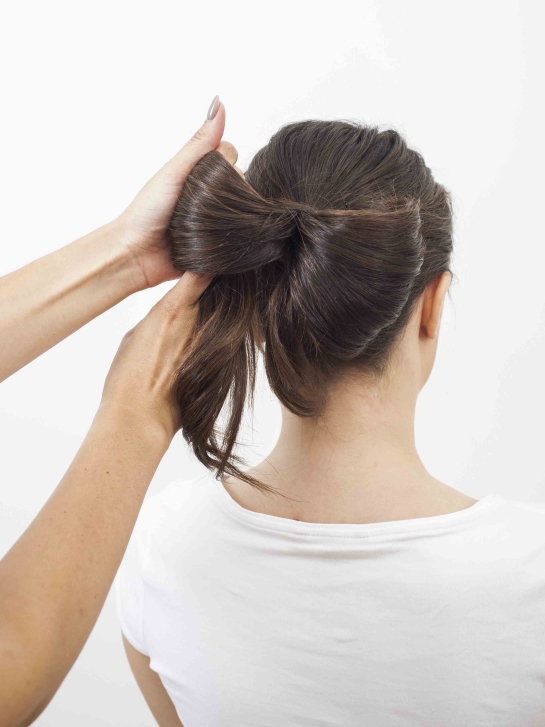 Krok szósty: Delikatnie rozłóż boki koka tworząc bardziej rozłożystą kokardę. Luźną część włosów – końce kokardy – puść swobodnie na karku. Możesz je dodatkowo delikatnie zakręcić używając prostownicy.