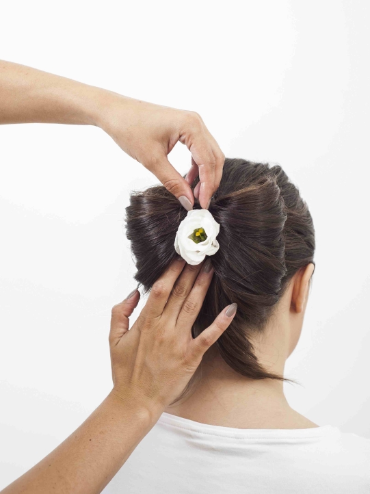 Krok siódmy: Gdy nadasz kokardzie pożądany kształt, spryskaj włosy lakierem, aby utrwalić efekt. Fryzurę możesz dopełnić dopinając do niej pojedyncze kwiaty, np. w samym środku kokardy.