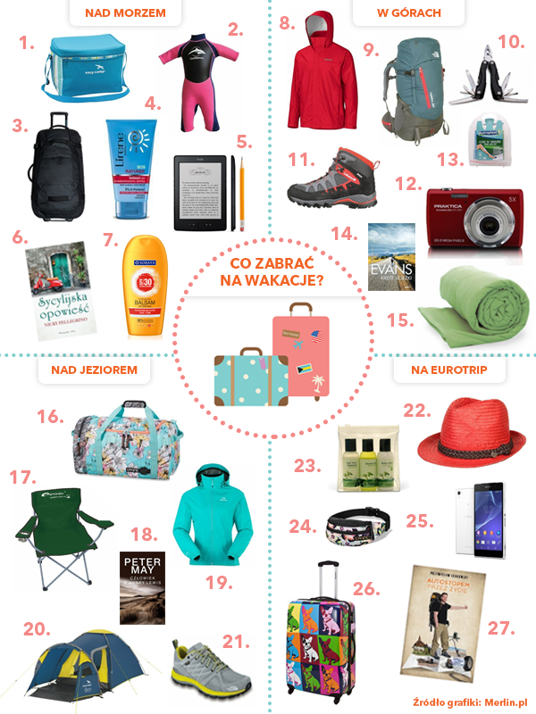 To, co planujemy ze sobą zabrać, zależy nie tylko od tego, jak, ale przede wszystkim gdzie planujemy spędzić urlop. Czego nie może zabraknąć na naszej wakacyjnej check-liście? Merlin.pl podpowiada, co może przydać się w górach, nad morzem, w mieście i na campingu.
