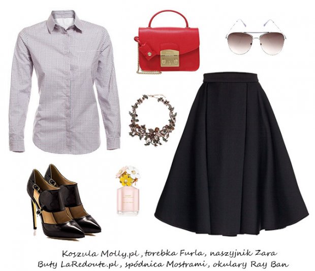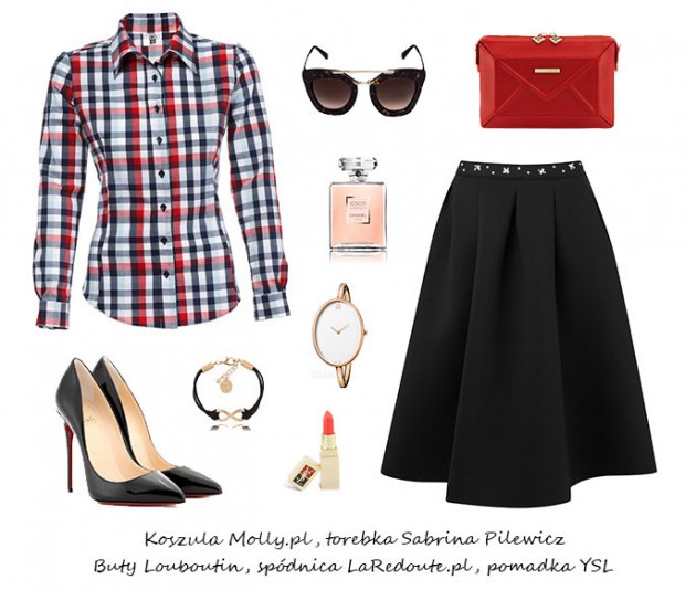 Dobrze dopasowana koszula, z wiązaną kokardą przy szyi to świetny wybór do pracy, na rozmowę kwalifikacyjną czy spotkanie biznesowe. Delikatna kratka w połączeniu z klasyczną spódnicą z koła sprawi, że twój look będzie elegancki, ale też bardzo kobiecy. Charakteru całości nadadzą połyskujące szpilki i modny w tym sezonie worek zamiast torebki.