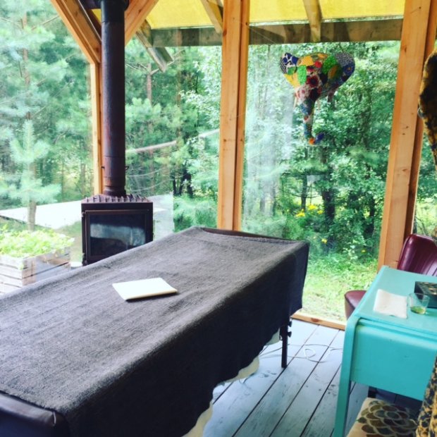 Stanowisko do masażu to drewniany domek. Gdy jest ładna pogoda, masaże odbywają się na tarasie pod gołym niebem! Dzień był chłodniejszy, więc przeniosłyśmy się do środka, ale przeszklone ściany i tak dają poczucie jedności z naturą. Łóżka do masażu są ogrzewane elektrycznymi kocami, więc nie sposób na nich zmarznąć.