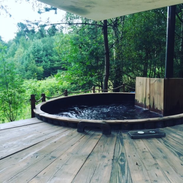 Pod gołym niebem możesz skorzystać z kąpieli w balii. Widok jest boski, a woda gorąca. Co chwila trzeba się schłodzić pod zimną strumieniem. Bąbelki działają relaksująco. Zwłaszcza jeśli towarzyszy im kieliszek cydru…