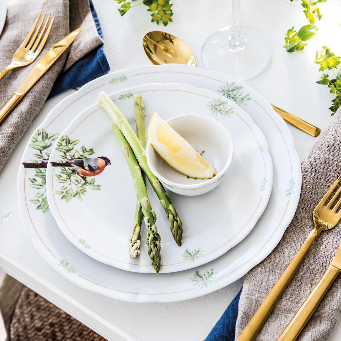 Wiosna nieodmiennie kojarzy się nam ze śpiewem ptaków. Wszechstronna i utalentowana projektantka, Anne Rooslien uwieczniła naszych skrzydlatych przyjaciół na zastawie Nordic Birds. Podczas jej tworzenia czerpała inspirację z różnorodności natury oraz magicznego świata na Gotlandii. Tak powstał wyjątkowy serwis, którego ozdobą jest dwanaście ręcznie malowanych ptaków uwiecznionych z wielkim wyczuciem i niesamowitą dbałością o szczegóły na porcelanie najwyższej jakości. Efektu dopełniają motywy gałązek wierzby, jarzębiny i wiśni, które dodają całości uroku i zapewniają oryginalną oprawę dla każdego dania zaserwowanego na zastawie.