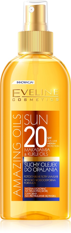 suchy_olejek_opalanie_SPF 20_EvelineInnowacyjna formuła bogata w zaawansowane składniki aktywne i fotostabilne filtry UVA/UVB zapewnia skuteczną, profesjonalną ochronę przed oparzeniami słonecznymi, przeciwdziała procesom fotostarzenia się skóry. Dzięki zastosowaniu nowatorskiej formuły WET APPLICATION COMPLEXTM preparat można stosować nawet na mokrą skórę. Nietłusta formuła łatwo się rozprowadza i nie powoduje przyklejania się ziarenek piasku do ciała.  Olejek makadamia silnie odżywia i nawilża skórę. Olejek kukui jest naturalnym filtrem przeciwsłonecznym. Chroni naskórek i nadaje opaleniźnie piękny kolor. Najnowszej generacji filtr SPF 20niweluje działanie wolnych rodników, skutecznie hamuje procesy fotostarzenia i zapobiega powstawaniu oparzeń.  Preparat wodoodporny – chroni skórę również podczas kąpieli.