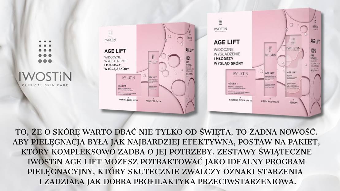 Aby pielęgnacja przyniosła wymierne efekty, warto postawić na konkretny plan, a najlepiej na linię kosmetyków, które wzajemnie się uzupełniają. Warto zwrócić uwagę na to, by działały na wielu poziomach – nie tylko przeciwzmarszczkowo, ale również nawilżająco. Najlepiej znaleźć produkty, które będą dedykowane indywidualnym potrzebom skóry – czy to do cery normalnej, mieszanej czy suchej. Nie zapominajmy o skórze wokół oczu, która wymaga zarówno szczególnej uwagi, jak i delikatnego podejścia. Linia IWOSTiN AGE LIFT to dermokosmetyki stworzone z myślą o potrzebach cery dojrzałej, które opóźniają procesy starzenia, przywracając skórze młody oraz zdrowy wygląd. Produkty AGE LIFT skutecznie redukują zmarszczki, zwiększają elastyczność i zapewniają nawilżenie do 24 godzin. Formuły bazują na składnikach aktywnych, które stymulują produkcję własnego kolagenu, poprawiają jędrność, wyrównują koloryt, niwelują przebarwienia oraz przywracają skórze pełen blasku wygląd. Mają bardzo przyjemną konsystencję i szybko się wchłaniają, a ich skuteczność została potwierdzona w badaniach klinicznych. Teraz dostępne w zestawach świątecznych, które tworzą rytuał pielęgnacyjny na miarę potrzeb nawet najbardziej wymagającej skóry dojrzałej.