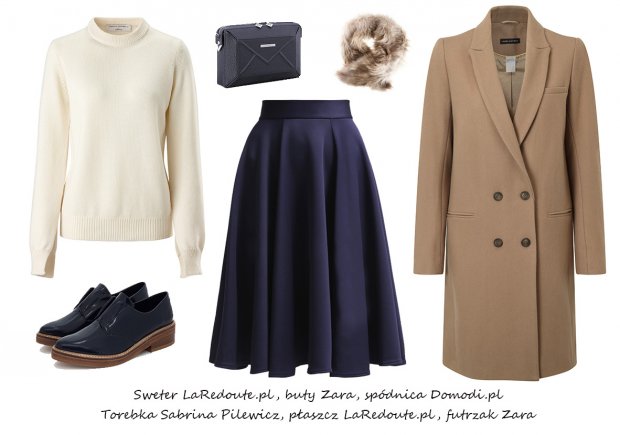 Na koniec coś dla wielbicielek kolorów beżowych i ecru, które w tym sezonie świetnie współgrają z granatem. To nowa czerń, która rozświetla całą stylizację i nadaje jej innego charakteru. Elegancka, rozkloszowana spódnica, sweterek z półgolfem, ciężkie buty i płaszcz w męskim stylu sprawią, że całość będzie prezentowała się wiście mediolańskim stylu.
